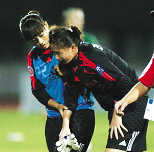 中澳比賽進(jìn)行到下半時(shí)后半段,屈珊珊后場(chǎng)開(kāi)球拖延時(shí)間被黃牌警告。傷停補(bǔ)時(shí)階段,門(mén)將張?jiān)匠鰮羰軅蟮沟夭⒔邮荜?duì)醫(yī)進(jìn)場(chǎng)治療,此時(shí)澳大利亞球員杰西卡卻認(rèn)為中國(guó)隊(duì)隊(duì)醫(yī)故意拖延比賽時(shí)間,與中國(guó)隊(duì)員發(fā)生肢體沖突。印度主裁判本迪卡在與韓國(guó)助理裁判商量后,將澳大利亞隊(duì)杰西卡紅牌罰下,這引起了澳大利亞主教練的大大不滿。