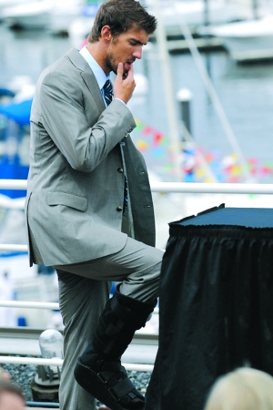對(duì)菲爾普斯來(lái)說(shuō),戰(zhàn)勝奧尼爾似乎不那么簡(jiǎn)單,因?yàn)樗谥暗能嚨溨信獋擞夷_,發(fā)布會(huì)上,他全程都用護(hù)具緊緊包裹著傷腳,但是菲爾普斯笑著說(shuō):“兵不厭詐,這個(gè)護(hù)具將會(huì)對(duì)奧尼爾造成困惑,他一定會(huì)迷惑我到底能發(fā)揮到幾成,哈哈,我們賽場(chǎng)上見(jiàn)!
