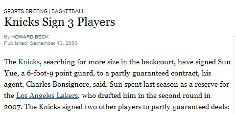 中新網(wǎng)9月14日電 北京時(shí)間昨日晚,《紐約時(shí)報(bào)》曝料稱:孫悅的經(jīng)紀(jì)人查爾斯·包辛諾透露,尼克斯已經(jīng)同中國(guó)球員孫悅簽訂了一份部分保障合同,補(bǔ)強(qiáng)球隊(duì)后場(chǎng)。
