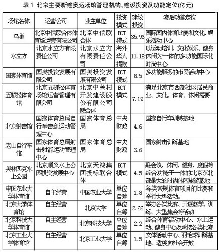 北京奧運(yùn)場(chǎng)館建設(shè)積極借鑒發(fā)達(dá)國(guó)家的先進(jìn)經(jīng)驗(yàn),采用BOT模式(指在大型體育場(chǎng)館的建設(shè)中引入民間資本進(jìn)行建設(shè),場(chǎng)館建成后,政府允許其享有一定時(shí)期的經(jīng)營(yíng)權(quán)及經(jīng)營(yíng)收益,之后政府即無(wú)償收回經(jīng)營(yíng)權(quán)),將場(chǎng)館建設(shè)與賽后利用有機(jī)地結(jié)合起來(lái)。北京12個(gè)新建奧運(yùn)場(chǎng)館共投資83.69億元,其中業(yè)主自籌占50.46%,地方財(cái)政投資占25.51%,國(guó)家財(cái)政投資占10.67%,海外華人捐贈(zèng)占13.35%(見表1)。一年來(lái)奧運(yùn)場(chǎng)館的經(jīng)營(yíng)業(yè)績(jī)證明這種模式是成功的,這無(wú)疑為今后我國(guó)大型體育場(chǎng)館的建設(shè)和賽后利用提供了可資借鑒的經(jīng)驗(yàn)。