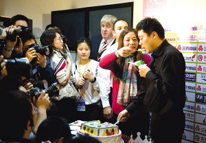 贏得了比賽,走進(jìn)新聞中心的丁俊暉非常開心,“今天比賽很精彩,打得還可以,上來就比較集中精力,今天比較動腦子,一個(gè)機(jī)會得分,還能贏下比賽!边@時(shí)的丁俊暉完全不知道還有一個(gè)意外的驚喜在等著他。在簡單回答了記者的幾個(gè)問題之后,賽事組委會的工作人員推上了一個(gè)臺球桌形狀的生日蛋糕,F(xiàn)場所有的記者和工作人員共同為丁俊暉唱響了生日歌,整個(gè)新聞中心變成了一個(gè)生日party!在所有人的祝福聲中,丁俊暉吹滅了生日蠟燭、切了蛋糕。