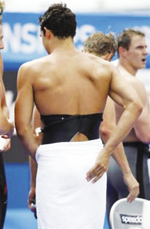 意大利時間昨天下午進(jìn)行的男子4×100米自由泳接力預(yù)賽中,伯恩斯代表美國隊參加了第三棒比賽。當(dāng)他出發(fā)起跳時,泳衣臀部裂開一條大口子,但敬業(yè)的伯恩斯仍舊堅持游完全程,上岸后尷尬的美國小伙子迅速用一條白色大毛巾遮住了走光的臀部。最終美國代表隊以3分11秒64、預(yù)賽第四名成績晉級決賽。