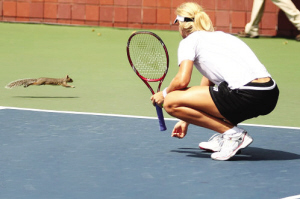 昨天中午,正當(dāng)眾多大腕在訓(xùn)練場進(jìn)行最后練習(xí)的時候,一只松鼠突然闖入訓(xùn)練場。突然面對這么多人、還有這么多來回移動的網(wǎng)球,受到驚嚇的小松鼠有些不知所措。在場地周圍來回奔跑,甚至橫穿了德娃正在訓(xùn)練的球場。中途,它還遇到一只網(wǎng)球擋路,它還不得不跟網(wǎng)球“搏斗”了一番,引得場外球迷的一片驚訝聲。