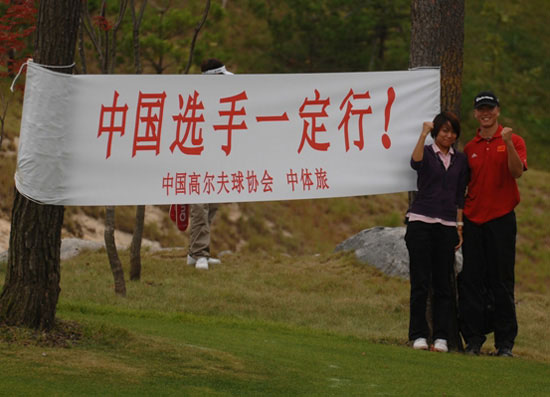 中新網(wǎng)首爾9月25日電 (張哉麟) 2009“韓國KEB銀行”中韓職業(yè)高爾夫球巡回賽韓國站比賽今日在韓國OSTAR高爾夫球俱樂部繼續(xù)進(jìn)行,球場邊有橫幅上面用中文寫著“中國選手一定行!”,有工作人員還在這橫幅面前,與中國選手合影留念。
