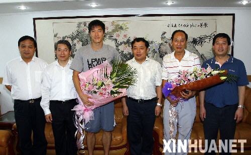 上海莘莊訓(xùn)練基地,上海市普陀區(qū)委書記周國雄等人當(dāng)日代表普陀父老鄉(xiāng)親為即將出征全運會的劉翔壯行——劉翔是“土生土長”的普陀人;疑玊恤,灰色短褲,踏一雙亮黃色的運動鞋,剛睡過午覺的劉翔看起來氣色不錯。