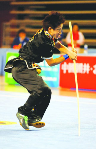 曹靜最后一個出場,當時形勢對她極為有利,只要拿到9.65分,冠軍就非她莫屬。動作質量和難度對曹靜來說沒有任何問題,關鍵是動作連接不能出現一點失誤。還是一身黑衫,最后一個出場的曹靜持刀往場地上一站,一個深呼吸,然后是一個威風的亮相,頓時全場一片叫好聲。隨后刀光一閃,曹靜快如閃電,疾如驟風,翻轉、騰挪,在陣陣喝彩聲中,曹靜舞出刀影重重。兩個馬步,一個劈叉,全都穩(wěn)穩(wěn)當當。最后,曹靜將刀拋出,然后飛身將刀穩(wěn)穩(wěn)地接在了手中。 9.83,裁判打出了全場最高分。加上棍術的得分,曹靜總分拿到19.64分,高出劉曉蕾0.19分。曹靜以巨大優(yōu)勢獲得冠軍,劉曉蕾、馬嵐分獲亞軍和季軍。有意思的是,這三人也是本次比賽女子長拳的金銀銅得主。