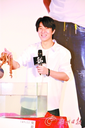 成龍雖未到場,房祖名卻請來了時下最火的明星“章魚哥”保羅來為新專輯的成績做預(yù)測。房祖名分別將“金曲獎”和“銷量突破50萬”兩個心愿牌放在兩個被罩住的魚缸前,并許愿說,“得‘金曲獎’比較現(xiàn)實點,章魚哥你還是選‘金曲獎’這邊的魚缸吧!”揭開幕布,“章魚哥”果然沒讓房祖名失望。他高興得立即從缸里撈起“章魚哥”,猛地一陣愛撫,隨后發(fā)現(xiàn)保羅沒什么精神時,房祖名緊張大呼“趕緊送‘章魚哥’去醫(yī)院治。 (記者 程雪超 攝影報道)