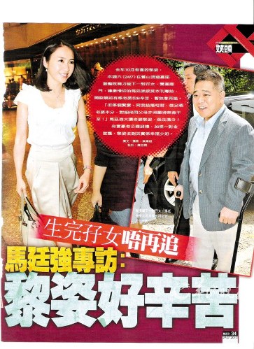 記者問他有沒有進(jìn)產(chǎn)房陪太太,馬廷強說:“我沒進(jìn)產(chǎn)房。黎姿要打麻醉針,加上我拄著拐杖,不是很方便,所以留在產(chǎn)房外等。她生完BB后從手術(shù)室出來,我就立刻去看她!