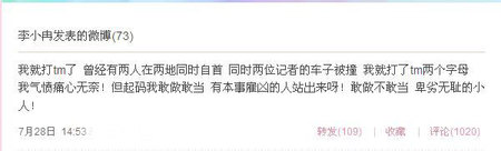 最近福建兩位記者因揭露“紫金礦業(yè)”,結(jié)果在同一天兩位記者的車子同時(shí)被撞。李小冉尤其關(guān)注這則新聞,她在昨日中午的微博中發(fā)飆:“天災(zāi)就夠叫人無(wú)奈的了,人禍也是沒完沒了。”她還 在微博中爆粗口,引來(lái)粉絲圍觀,認(rèn)為其有損形象。