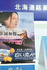 舒淇主演的《非誠(chéng)勿擾》去年在中國(guó)創(chuàng)下驚人票房,帶動(dòng)取景地日本北海道觀光人潮,旅游業(yè)者趁勢(shì)推出電影套裝行程,當(dāng)?shù)孛a(chǎn)“白色戀人”餅干更把海報(bào)當(dāng)免費(fèi)宣傳,在當(dāng)?shù)仉S處可見,連名古屋機(jī)場(chǎng)也看得到,可說(shuō)是揚(yáng)威日本。