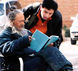在《孔子》拍攝地外面的道路上,擺放了一排不同規(guī)格和等級的戰(zhàn)車,可見在這部戲中,大場面,儀式性的戲不會少。帶妝后的周潤發(fā)讓不熟悉的人一時還很難看出:花白成髻的頭發(fā)、滿臉的胡須、紅潤的臉色、灰藍色的粗布長衫……發(fā)哥不時看看劇本,半疲憊半滄桑的神色很顯“圣人范兒”,而身邊的助理們也忙個不停,一會點煙一會送水,頗有眾星捧月之感。