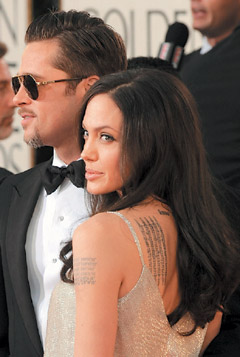 銀色情侶檔布拉德·皮特與安吉莉娜·茱莉雙雙入圍金球獎(jiǎng),俊男美女搶盡鋒頭。茱莉穿Atelier Versace禮服、露出修長(zhǎng)玉腿和戴墨鏡的皮特十指緊扣踏上星光大道,但兩人都以微笑代替說(shuō)話,連媒體想訪問(wèn)皮特,都被茱莉巧妙帶開(kāi)。