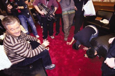 1月28日,北京,央視春節(jié)聯(lián)歡晚會在1月25日除夕夜舉行。零點鐘聲敲響后,與師傅成功搭檔表演小品《不差錢》的小沈陽和眾徒弟按照東北習慣,跪地給師傅趙本山磕頭拜年。