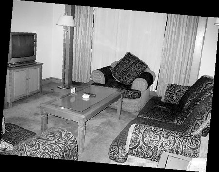 而在劇中和陳好演對(duì)手戲的“呂布”何潤(rùn)東待遇就差點(diǎn),和記者同住在影視城賓館,不過(guò)記者住的是標(biāo)房,他住的是套房。記者剛?cè)胱r(shí),服務(wù)員就熱情介紹:“最近這段時(shí)間,何潤(rùn)東和陸毅都住在我們這里,他們都是老顧客了,很親切的,遇見我們都會(huì)朝我們微笑、打招呼。”何潤(rùn)東所住的套房,每層只有一間,掛價(jià)一千元,打折后是388元。記者昨天進(jìn)了11層的唯一一間套房——409房查看一番。