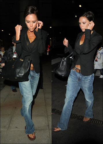 當天的維多利亞·貝克漢姆身穿黑色西裝外套,里面則是搭配了黑色露臍抹胸,下面穿了肥大的牛仔褲,小編驚奇的發(fā)現(xiàn),維多利亞居然當天沒有穿高跟鞋,而是換了平底的拖鞋,很是少見,難道貝嫂轉性啦??? 但是連高跟鞋都可以脫掉的貝嫂絕對不變的就是那張黑臉了。