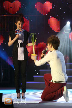 這位當(dāng)紅的人氣偶像不僅迷倒了在場的觀眾,連“海豚王子”王櫟鑫都拜倒在林依晨的裙下,現(xiàn)場更是搞笑上演抱蔥求婚一幕。林依晨獻(xiàn)唱了《你》后,在特別環(huán)節(jié)中接受了演技大考驗,主持人即興要求林依晨表演“求婚”的橋段。這時,一旁的王櫟鑫按耐不住,自告奮勇上臺“求婚”。調(diào)皮的王櫟鑫手捧一顆大蔥,單腿跪下對林依晨深情告白:“親愛的晨晨,我知道你喜歡直樹,所以我送你一顆蔥。雖然我沒有你家直樹帥,但我會每天為你唱情,對你好,嫁給我好嗎?”惹得現(xiàn)場觀眾大笑不已,一邊的男主持人大左更是醋意大發(fā),直言喜歡林依晨很久,也要向她求婚,不過大左的求婚禮物是非常具有長沙特色的臭豆腐。面對一大盤黑乎乎的臭豆腐,林依晨似乎被其獨特的氣味嚇到,捂著鼻子直呼“我還是選擇蔥吧!”場面十分搞笑,晚會氣氛也達(dá)到了高潮。