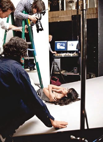 雖然Sorrenti的要求難度極高,甚至要章子怡躺在地板上,她非常專業(yè)完全沒有推托,讓站在梯上的Sorrenti以俯身姿態(tài),俯拍其長發(fā)飄逸的大頭照片。