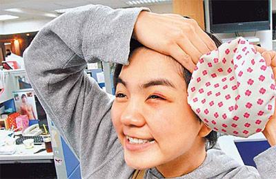 她左眼立刻腫起及嚴重瘀青,她回家后不斷冰敷,還慶幸:“只差一點,就打到眼球,好險!”樂觀的她昨進所屬華研音樂辦公室,還大喊:“快來看團團圓圓,來我這里看貓熊免排隊喔!”不過她現(xiàn)在最擔心周五預定要拍廣告,目前左眼的瘀青沒把握來得及消褪,華研表示若屆時傷勢未痊愈,只好跟廠商協(xié)調延期拍攝。