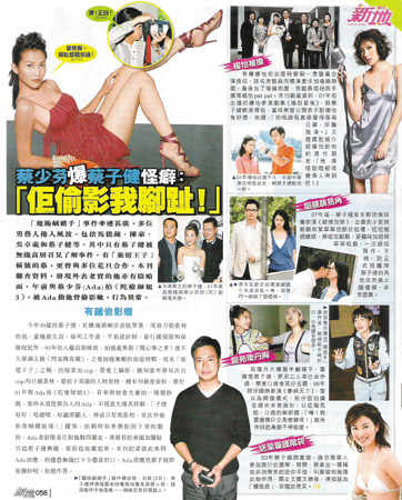 今年39歲的蔡子健,進(jìn)入演藝圈之前曾當(dāng)過(guò)救生員、福利工作者、平面設(shè)計(jì)師、旅行團(tuán)領(lǐng)隊(duì)和保險(xiǎn)經(jīng)紀(jì)等,1993年加入無(wú)線藝員訓(xùn)練班,拍完情景劇《開(kāi)心華之里》后不久便被調(diào)去主持《閃電傳真機(jī)》節(jié)目,之后拍過(guò)無(wú)數(shù)旅游特輯,故有“旅游王子”之稱(chēng)。因經(jīng)常出差,他愛(ài)上攝影。據(jù)資料顯示,2001年,蔡子健與蔡少芬合拍《陀槍師姐3》時(shí),兩人演夫妻拍一場(chǎng)婚紗戲。當(dāng)時(shí)蔡少芬不經(jīng)意地大爆蔡子健的怪癖:“子健人不錯(cuò),很懂得照顧人,還整天幫我照相,有一次還偷拍我的腳趾!”據(jù)知,拍劇時(shí),蔡少芬經(jīng)常貪舒服穿著拖鞋到處走,其修長(zhǎng)的美腿和腳趾引起蔡子健的興趣,所以拍下來(lái)作收藏。近日,記者就此事詢問(wèn)蔡少芬,但據(jù)悉無(wú)線已下令藝員“封口”,蔡少芬對(duì)關(guān)于蔡子健的問(wèn)題立即裝聾扮啞,拒絕作答。