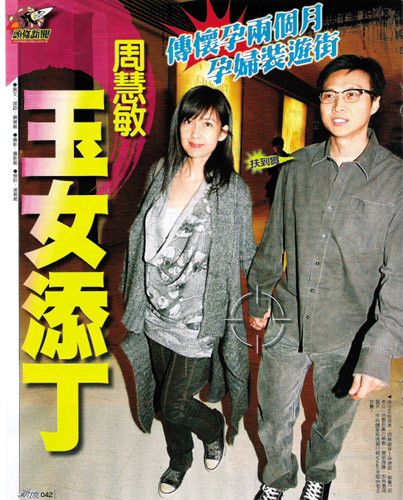 據(jù)昨日出版的某香港周刊爆料,周慧敏近日出席活動(dòng)時(shí)被發(fā)現(xiàn)肚子凸起疑似有喜,而上周該周刊記者又在街上撞見她身穿孕婦裝偕夫出游,似乎新婚不足兩個(gè)月已“好事成雙”。有傳言指,原來(lái)在“倪震濕吻事件”發(fā)生后不久,周慧敏已發(fā)現(xiàn)自己“有喜”,這才是令倪震戲劇性浪子回頭的最大原因。