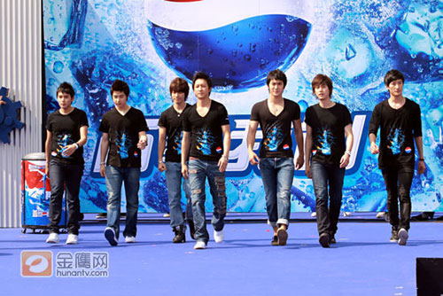 新加盟成員SJ-M先聲奪人,如古代騎士般在塔樓尖上出現(xiàn)的他們立刻引起了在場歌迷的陣陣尖叫。而后古天樂、蔡依林、李準(zhǔn)基、羅志祥、黃曉明在印有該品牌標(biāo)識的大卡車頂緩緩出現(xiàn),12位成員當(dāng)場在臺上互相潑水取樂,宛如畫面。