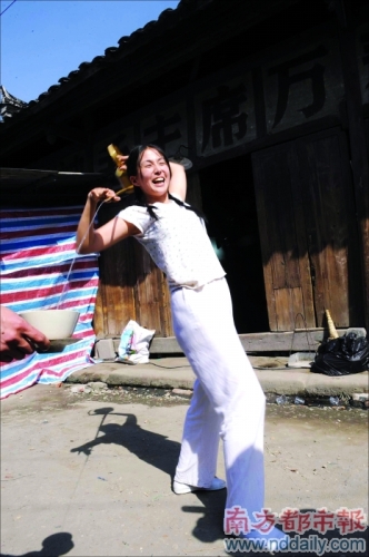 當天拍攝的戲份講述茶館小妹安雅在屋內練習耍長嘴壺的手法,被瘋子郭濤從窗外看見,由遠至近靠近安雅,要指點她,最后貼身輔導的一段戲。據(jù)陳果介紹,這段戲是片中最重要的一場感情戲,也是兩人擦出感情火花的瞬間。