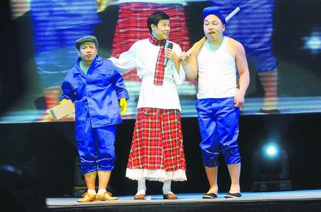 晚9時40分許,全場響起最熱烈的掌聲和叫好聲,“小沈陽!陽仔出來了”的叫喊聲此起彼伏。這次小沈陽雖然還是一身蘇格蘭裝扮,但頭上沒有發(fā)卡,手上的女士花包幾乎沒上過肩,聲音也變得陽剛起來,只在調(diào)節(jié)氣氛時偶爾用一下他擅長的“嚎”音,儼然有轉(zhuǎn)型的味道。接下來的約40分鐘,不管是中國足球的笑話、還是翻唱《大!返,場面上熱鬧非常,但關(guān)注小沈陽的人會發(fā)現(xiàn),這些東西他已經(jīng)演過很多遍了!