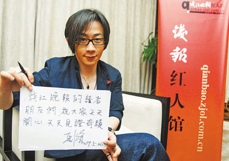 2009年兩大春晚紅人之一——?jiǎng)⒅t,來(lái)到錢報(bào)紅人館做客了。坐在本報(bào)記者面前的沙發(fā)上,遭遇到“近景魔術(shù)是否將如同選秀一樣走向死亡”這樣并不令人愉快的話題,劉謙連眉毛也不跳一下,依舊保持著他典型的職業(yè)化的笑容,胸有成竹地拆招:“就算選秀死了,不代表將來(lái)人們就不唱歌了,魔術(shù)同樣是不可缺少的。其實(shí),我根本不擔(dān)心這個(gè)問(wèn)題!