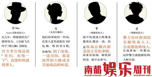 一個(gè)手底下帶著以曲藝形式包裝的Live樂隊(duì)的經(jīng)紀(jì)人老Tan對(duì)本報(bào)記者透露,自己也曾遇到過這種情況,對(duì)方拿出毒品說“哥們,來吸一下”,這個(gè)時(shí)候,如果你不夠圓滑,直接拒絕就可能得罪對(duì)方!叭绻易哌M(jìn)包房,聞到有什么異樣的味道,我就會(huì)待一會(huì)兒,趕緊走。如果真躲不過被對(duì)方問到,我也會(huì)找個(gè)理由,比如上廁所或者其他什么的,溜掉?隙ú荒茏寣(duì)方覺得我不把他當(dāng)哥們。當(dāng)然,這也是一時(shí)之計(jì),時(shí)間長了,人家也知道你不好這口,干脆就不帶你玩兒了! 也有某經(jīng)紀(jì)人W說:“我不知道請人吸毒是最高禮遇這一說,但是吸毒在圈內(nèi)都是很正常的事情。如果有原則,夠堅(jiān)持的話,就不會(huì)參與。我看見有人吸,也會(huì)勸勸對(duì)方別沾這個(gè)。不過圈內(nèi)最正常的玩法還是喝酒和泡妞!