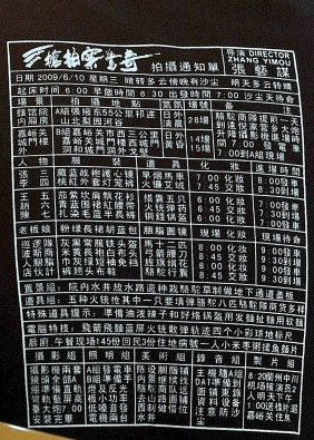 記者從這份泄密的拍攝通知單上發(fā)現(xiàn):今天拍攝的將主要是張三(孫紅雷)和李四(小沈陽(yáng))之間的對(duì)手戲,其余人物還有王五、趙六以及陳七、老板娘、巡邏隊(duì)、波斯商、人胭脂、店伙計(jì)。拍攝道具則包括旱煙、馬車、火鐮、搭囊、火筒彈藥、弓箭、腰刀等,另有駱駝以及馬12匹?磥(lái)今天拍攝的大部分都是外景。有意思的是,這張拍攝通知單上還有一條“特殊道具提示”:油潑辣子、烙鍋盔用發(fā)面,扯面用軟面。而午餐現(xiàn)場(chǎng)是145份,說(shuō)明這個(gè)劇組規(guī)模還是不小。細(xì)心的工作人員還注明:“住地病號(hào)一人:小米棗粥搓魚(yú)面片!笨磥(lái)之前所傳劇組伙食不錯(cuò)的消息果然不假。
