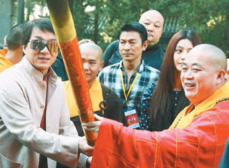中新網(wǎng)10月23日電 劉德華將在新片《新少林寺》中拜成龍為師學功夫!昨天河南少林寺的寧靜被打破,宣揚武術(shù)精神的《新少林寺》開鏡,成龍、劉德華、謝霆鋒、范冰冰、吳京齊聚少林寺,現(xiàn)場貴賓、武校學生見到巨星全變粉絲,拚命圍上前來,場面一度失控,成龍則發(fā)揮大哥本色指揮現(xiàn)場,呼吁大家維持秩序。