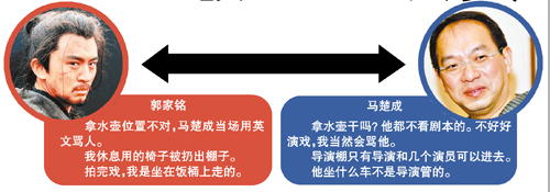 馬楚成說:“我對(duì)郭家銘是有意見。我是很少罵人的導(dǎo)演,為什么我罵了他?為什么片場的化妝、梳頭這些工作人員都不喜歡他?我覺得他應(yīng)該檢討一下自己。他的戲演得不好,我讓他演一場醉酒的戲,開拍之前他喝了很多酒,正式拍的時(shí)候他竟然醉到了沒法拍的地步,要第二天重拍。他們那邊又說第二天不行,他要去云南拍一個(gè)電視劇。我很生氣,因?yàn)樗麄冞M(jìn)組前告訴我說已經(jīng)推掉了云南那個(gè)戲,怎么能刻意騙人呢?搞得我們的戲卡在那里。再說他拿著水壺的那場戲,他都不看劇本的,大家都沒水喝了,他拿那么大壺水干嗎?自己不好好演戲,我當(dāng)然會(huì)罵他啦。我讓他演戲不要那么夸張,他不聽,當(dāng)自己大牌,那我就只好刪他的戲了。他還不斷地問我為什么不拍他的特寫,這部戲叫做《花木蘭》哦,每個(gè)群眾演員、每個(gè)小角色都給很多特寫,這戲還怎么演?”
