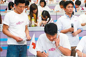 據(jù)“聯(lián)合早報”消息,香港演藝圈為了幫助臺灣受災(zāi)民眾盡快重建家園,積極動員,與臺灣藝人聯(lián)手舉辦《88水災(zāi)關(guān)愛行動》。劉德華水災(zāi)后第一時間飛抵臺灣賑災(zāi),返港后更是召集200位藝人,趕工錄制“88水災(zāi)關(guān)愛行動”主題曲《滔滔千里心》。擔(dān)任總召的他,一下飛機便直奔活動現(xiàn)場,強打精神緊盯各個環(huán)節(jié),不但親手寫大字報,更扯破喉嚨指揮全場。