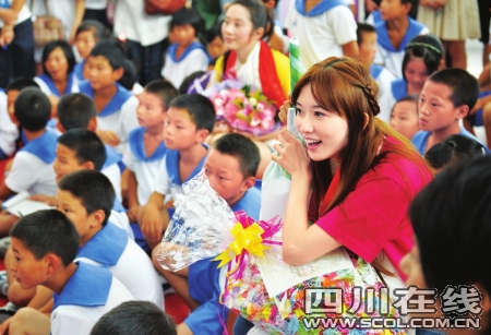 昨日上午,林志玲領(lǐng)銜,曾寶儀、光良、江美琪、許慧欣、謝娜、譚維維、胡彥斌、弦子、楊紫等走進了嶄新的“安康家園”棠湖小學(xué),這里生活著幾百名因地震受創(chuàng)的孩子。而在校區(qū)食堂,一個簡單隆重的“愛在傳遞”安康家園兒童心系臺灣小朋友活動正在舉行,60余位小朋友看著電視上的大明星來到了他們身邊,都非常興奮,還獻上了潔白的哈達。