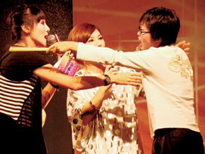 該歌迷迫不及待地?fù)屵^(guò)主持人的話筒講話,并與主持人發(fā)生沖突。梁靜茹立即變成勸架人,令歌友會(huì)頓時(shí)降溫不少。