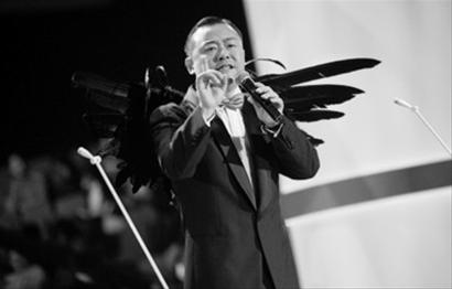 當(dāng)晚,周立波一身筆挺修身的黑西裝在舞臺(tái)上亮相,只不過背后“長(zhǎng)”出了一雙黑色的羽毛翅膀,最搞笑的是,他居然提了個(gè)小板凳,然后直挺挺地站了上去,因?yàn)樗車拿琅畟(gè)頭都比他高!拔医裉斓脑煨推鋵(shí)是個(gè)天使,但很多人說我像只烏鴉,但你們別把烏鴉不當(dāng)鳥,別把饅頭不當(dāng)點(diǎn)心!”