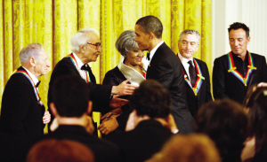肯尼迪中心榮譽(yù)獎是美國為表彰演藝界杰出人士而設(shè)置的終身成就大獎。在本屆頒獎典禮上,美國總統(tǒng)奧巴馬6日攜夫人米歇爾親自到場慶賀。對于五位獲獎藝人,奧巴馬在致詞中表示:“這些藝術(shù)家確實是最棒的。他們是現(xiàn)世的提醒者,時刻告訴我們這一事實——在這里,我準(zhǔn)備借用米歇爾的一句臺詞——這些藝術(shù)并不只是我們國民生活的一部分,它們是我們國民生活的核心!