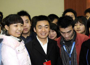 會議休會之后,工作人員安排他與邢臺的黨政領(lǐng)導(dǎo)見面,聞訊而來的大會志愿者們和大會部分工作人員爭相與王寶強合影留念,一時間見面會現(xiàn)場擁擠不堪亂作一團。