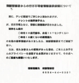 中新網(wǎng)8月6日電 5日,日本警方透露下落不明的女星酒井法子曾經(jīng)出現(xiàn)在山梨縣身延山附近。丈夫高相祐一因為攜帶毒品被警方逮捕以后,酒井法子帶著兒子為什么會出現(xiàn)在山梨縣境內(nèi)惹起網(wǎng)友眾多猜疑。