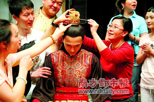 李少紅執(zhí)導(dǎo)的新版《紅樓夢》歷經(jīng)一年三個半月的緊張拍攝,終于在昨日殺青。“寶玉”楊洋也在這一天迎來了自己的18歲成年生日。昨日,劇組殺青之日,導(dǎo)演李少紅與近百名演職人員一起,為“成年寶玉”楊洋舉行了熱鬧的成人禮。李少紅親手為楊洋摘下通靈寶玉,象征劇組正式殺青;隨后,李少紅又為楊洋戴上金冠,取意“加冠成人”(左圖)。楊洋感動得語帶哽咽:“18歲生日在劇組度過,我覺得很有意義。它對劇組的拍攝工作是一個圓滿的終點,但對于我個人來說,卻是人生新的起點。”