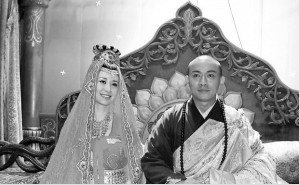 昨日拍攝的主要是唐僧在女兒國(guó)的戲份。女兒國(guó)國(guó)王舒暢身著紅色盛裝手牽唐僧聶遠(yuǎn)登上皇宮寶座,然后兩人并肩坐下,氣氛顯得有些曖昧……