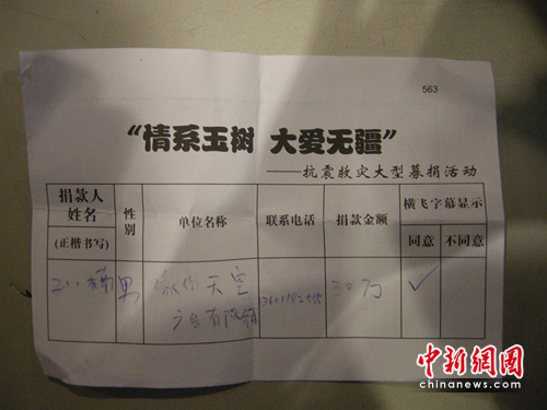 中新網(wǎng)4約0日電 今晚(4月20日)8時,《情系玉樹,大愛無疆——抗震救災(zāi)大型募捐活動特別節(jié)目》將在中央電視臺1號演播大廳舉行。過百演藝明星參與,在今天下午的排練現(xiàn)場,孫楠成為最早一批到達(dá)現(xiàn)場的歌手,并在第一時間捐出30萬現(xiàn)金,向?yàn)?zāi)區(qū)人民做出一份善舉。