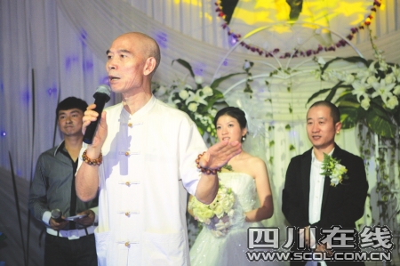 12點(diǎn)09分,婚禮正式開始,巴蜀笑星叮當(dāng)和朱軍聯(lián)袂主持。在6個(gè)“花仙子”的迎接下,李彧挽著陳燕琳,踏上紅色地毯,整個(gè)婚禮過程與傳統(tǒng)婚禮并沒有太大差別。叮當(dāng)宣布:“有請(qǐng)李伯清主婚登臺(tái)!”臺(tái)下300人立即爆出掌聲一片。李伯清登臺(tái),依舊是他那詼諧、幽默的風(fēng)格,面對(duì)觀眾妙語如珠,他說:“之所以由我主婚,是因?yàn)槔畋L飵啄昵霸诔啥寂臄z《王保長新篇》,他用了我的許多學(xué)生,演了很多角色。還教育我的學(xué)生怎樣做人。今天他兒子娶了四川姑娘,這就是說,李保田一家人,看得起我們四川人!”李伯清主婚,不改插科打諢的特長。宣稱自己就是李彧和陳燕琳的父母,將來有什么事找他就是了,引來現(xiàn)場(chǎng)笑聲不斷。