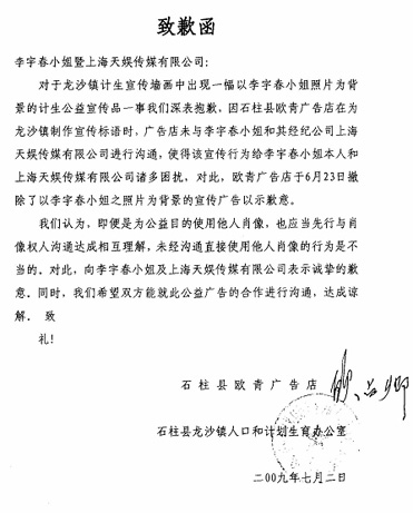 前不久有網(wǎng)友爆料李宇春的照片出現(xiàn)在了重慶市石柱縣龍沙鎮(zhèn)的計(jì)劃生育公益宣傳畫上,同時(shí)還打出“生男生女一樣好”的口號。天娛傳媒隨即指出此舉侵犯了李宇春的肖像權(quán)和名譽(yù)權(quán)。如今這張宣傳畫已經(jīng)被撤除,龍沙鎮(zhèn)人口和計(jì)劃生育辦公室還專程連同廣告公司一起向李宇春發(fā)出“致歉函”。