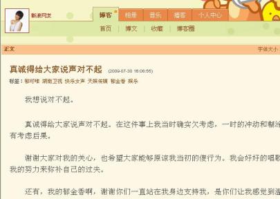 一直在“快女”中使用23歲年齡的郁可唯早前被網(wǎng)友爆料隱瞞已經(jīng)26歲的真實年齡,并被指出23歲的年齡與多項賽前經(jīng)歷產(chǎn)生沖突。此外,一名知情人還爆料,郁可唯確實出生于1983年,而今年參加“快女”是采用假身份證報名,目前已被識破,不過該消息并未得到天娛以及湖南衛(wèi)視方面的肯定。7月30日下午,郁可唯在個人博客中公開道歉,承認確實在“快女”比賽中改動過年齡:“真誠的給大家說聲對不起。在這件事上我當時確實欠考慮,一時的沖動和糊涂,沒有考慮后果!蹦壳耙阎稿e的郁可唯還表示希望當初的傻行為能夠被原諒,而她本人也會更努力的唱歌盡力彌補過失。