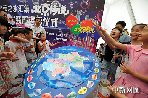 “北京之水匯集北京傳說”活動(dòng)是圍繞北京兒藝六一大戲《北京傳說》中的節(jié)水環(huán)保主題而開展的、面向北京所有小學(xué)生及學(xué)齡前兒童的大型環(huán)保節(jié)水公益行動(dòng),F(xiàn)場12位節(jié)水小明星代表一起把他們從北京各水系取來的水標(biāo)本匯集到“北京之水”大型環(huán)保容水裝置中,這一裝置高1.5米,它以藍(lán)色水波紋狀物體為底座,上方圓弧狀轉(zhuǎn)盤中用顯著顏色標(biāo)識(shí)出北京水系分布情況,5月28日至6月1日《北京傳說》演出期間,該容器將放置在水立方場內(nèi),成為一道環(huán)保新景觀。