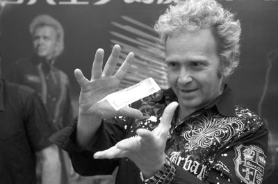 昨天下午,與哈拉利相比顯得少言寡語的蓋洛斯,卻用實際行動成了攝影、攝像機的焦點,掉包記者緊攥在手里的硬幣,讓皮夾子憑空著火,燒毀的錢幣卻赫然出現(xiàn)在未曾開封的小包裝白糖中——蓋洛斯的每一個“節(jié)目”都頗有上春晚與劉謙一較高下的潛質。事實上,蓋洛斯也是美國電視屏幕上家喻戶曉的明星,他的“今夜秀”連續(xù)創(chuàng)下收視佳績,早在劉謙之前,就成為真正意義上的 “魔術明星”。蓋洛斯的 “粉絲”還包括簡·方達、阿諾德·施瓦辛格、達斯汀·霍夫曼、艾迪·墨菲、羅賓·威廉姆斯、尼古拉斯·凱奇、湯姆·漢克斯等,星光璀璨,不勝枚舉。