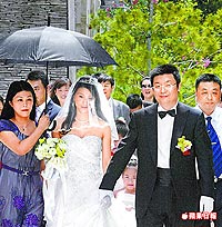昨早9時男方以6輛奔馳車隊(duì)至女方家迎娶,親友幫新娘撐的卻是黑傘,依民間習(xí)俗,一般新娘出嫁時,親友會以米篩遮陽,如果是撐黑傘,多半意味新娘腹中有喜。問新人是否有喜時,他們只說“謝謝”,未正面回答。證婚人鳳凰衛(wèi)視主席劉長樂入場時,被媒體問:“小孩是男的?女的?”他也未作答。