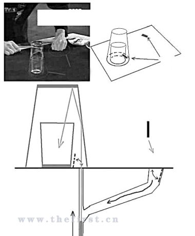 網(wǎng)友分析:在這個魔術(shù)中,我們可以注意到,大杯與小杯中間仍有縫隙,大杯是倒著放的,小杯則是正立著套在大杯里的。黑色的桌布主要是為了掩飾從桌下彈射硬幣的出口。在表演時,劉謙攥著硬幣的手曾一直放在桌子的左下角,其實(shí)那里正是硬幣進(jìn)入的地方。經(jīng)過桌下的機(jī)關(guān),硬幣順勢滑到杯子下方。觀眾們看到的是硬幣從小杯子與大杯子間的桌面射進(jìn)大杯然后被大杯壁和大杯底2次反彈后落入小杯中的。經(jīng)推斷,劉謙應(yīng)該還在桌子某個位置布置了一個彈射硬幣的機(jī)關(guān),從而讓硬幣從桌布下面射出來。