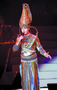 作為一個(gè)擁有自己時(shí)裝品牌的設(shè)計(jì)師,維塔斯的每次亮相都給人以華麗之感。昨晚,他更是頻繁換裝,從太空人造型到金燦燦的宮廷服裝以及鑲滿亮鉆的禮服,充分展現(xiàn)其王子形象。不過他每次唱完一兩首歌就要下臺(tái)換裝,空留樂隊(duì)在臺(tái)上演奏,樂隊(duì)一曲奏畢,他仍然沒有現(xiàn)身,幾度出現(xiàn)空?qǐng)龅那闆r。起先場(chǎng)下觀眾會(huì)禮節(jié)性地報(bào)以掌聲,但兩三次之后,有些觀眾便不耐煩地吹起口哨。好在每一次維塔斯重返舞臺(tái),都能迅速抓回觀眾。